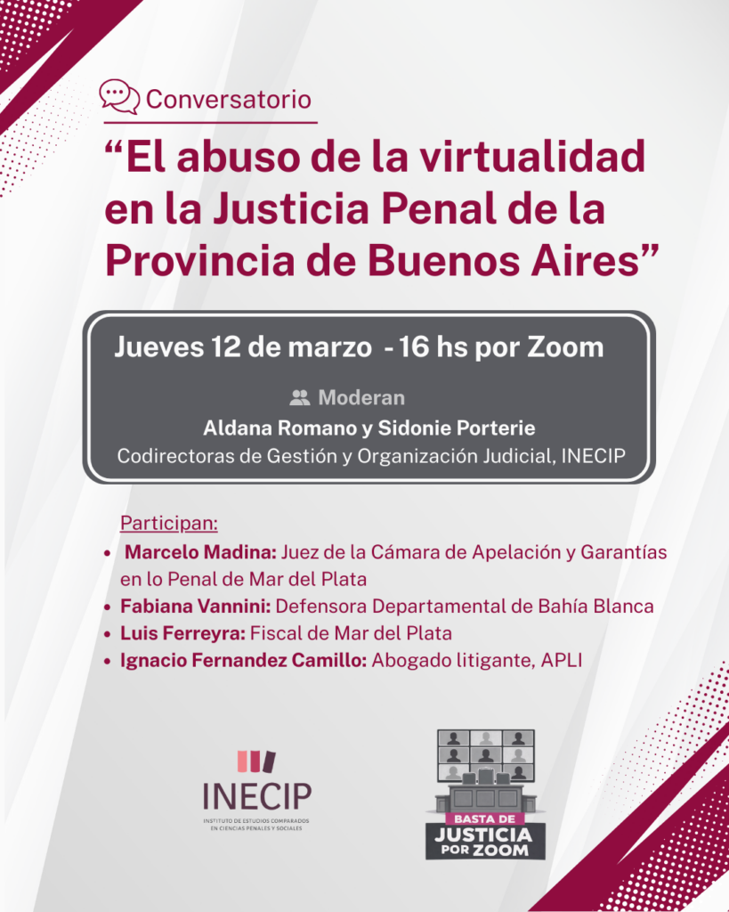 El Instituto de Estudios Comparados en Ciencias Penales y Sociales (INECIP) invita a participar del conversatorio «El abuso de la virtualidad en la Justicia Penal de la provincia de Buenos Aires», que se desarrollará de forma virtual el jueves 12 de marzo a las 16 hs.