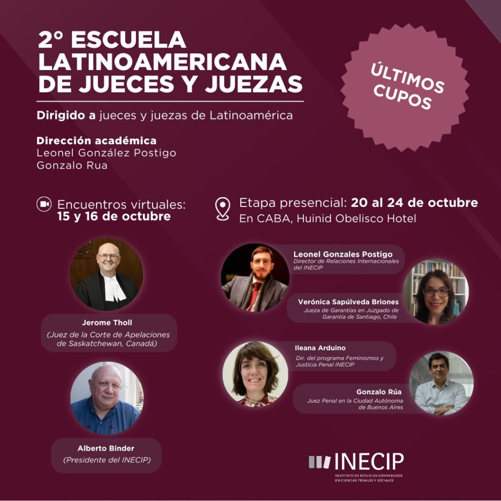 Están disponibles los últimos cupos para inscribirte a la II Escuela Latinoamericana de Jueces y Juezas, una propuesta formativa del Instituto de Estudios Comparados en Ciencias Penales y Sociales (INECIP), dirigida académicamente por Gonzalo Rua y Leonel González Postigo.
