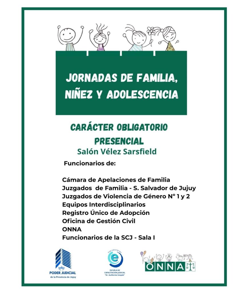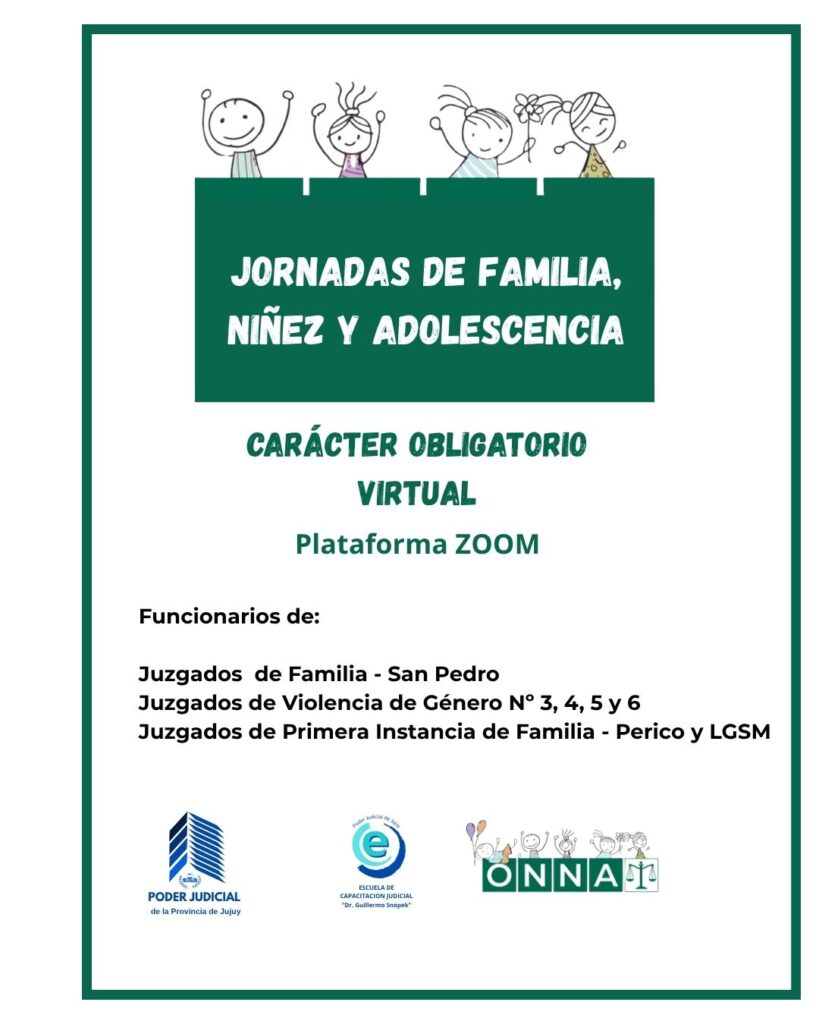 Las jornadas, se realizarán bajo modalidad híbrida el día 28 de abril del corriente año, de 9:00 a 12:00 y de 15:00 a 17:00 hs.; y estarán destinadas de manera obligatoria a Funcionarios de: Cámara de Apelaciones de Familia, Juzgados de Familia – S. Salvador de Jujuy, Juzgados de Violencia de Género Nº 1 y 2, Equipos Interdisciplinarios, Registro Único de Adopción, Oficina de Gestión Civil, ONNA, Funcionarios de la Suprema Corte de Justicia – Sala I, Juzgados de Familia – San Pedro, Juzgados de Violencia de Género Nº 3, 4, 5 y 6, Juzgados de Primera Instancia de Familia – Perico y LGSM.
