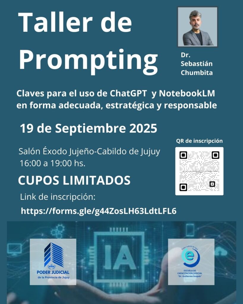Organizado por la Escuela de Capacitación Judicial “Dr. Guillermo Snopek”, se llevará a cabo el “Taller de Prompting – Claves para el uso de ChatGTP y NotebookLM en forma adecuada, estratégica y responsable”.