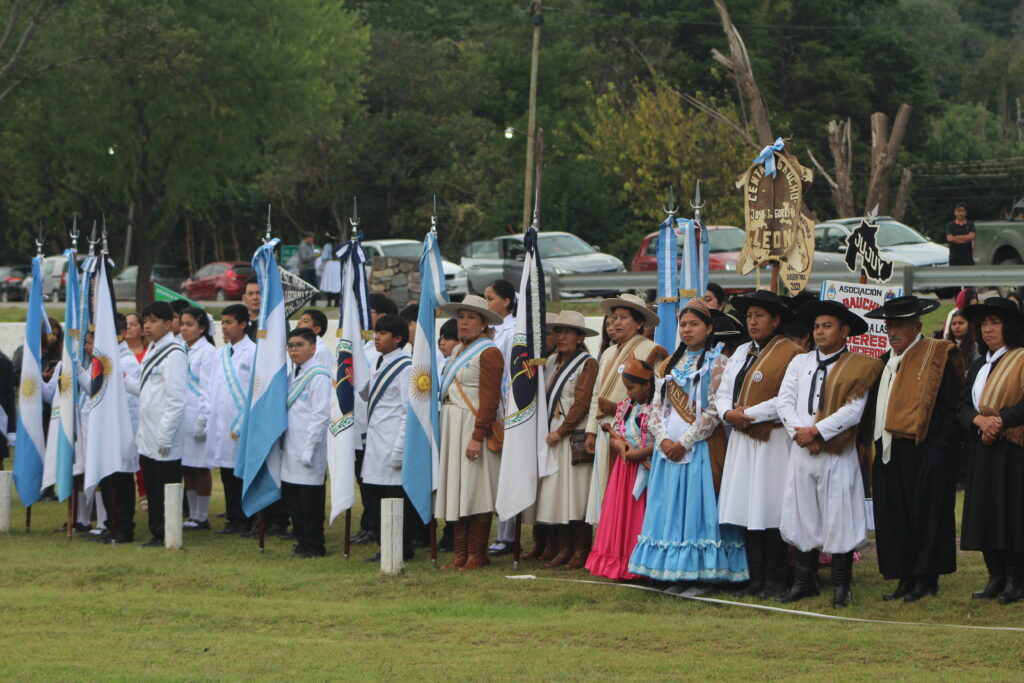 Finalmente, se realizó el desplazamiento de banderas, dando inicio al tradicional desfile cívico-militar, con la participación de instituciones educativas, fuerzas de seguridad, agrupaciones gauchas y organizaciones de la sociedad civil.