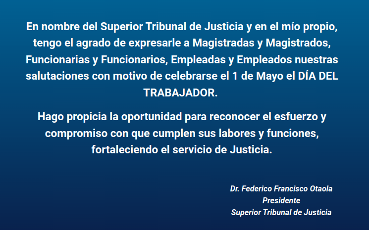 En nombre del Superior Tribunal de Justicia y en el mío propio, tengo el agrado de expresarle a Magistradas y Magistrados, Funcionarias y Funcionarios, Empleadas y Empleados nuestras salutaciones con motivo de celebrarse el 1 de Mayo el DÍA DEL TRABAJADOR. Hago propicia la oportunidad para reconocer el esfuerzo y compromiso con que cumplen sus […]