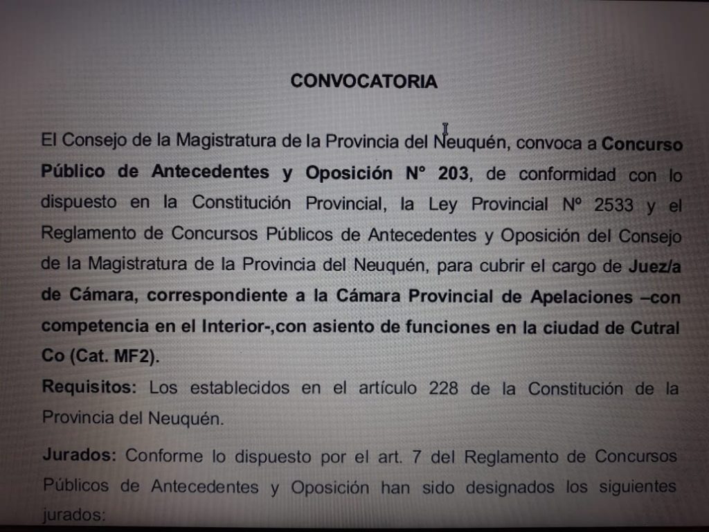 LLAMADO A CONCURSO PÚBLICO N° 203, DESTINADO A CUBRIR UN CARGO JUEZ/A DE CÁMARA, CORRESPONDIENTE A LA CÁMARA PROVINCIAL DE APELACIONES CON ASIENTO DE FUNCIONES EN LA CIUDAD DE CUTRAL CO.