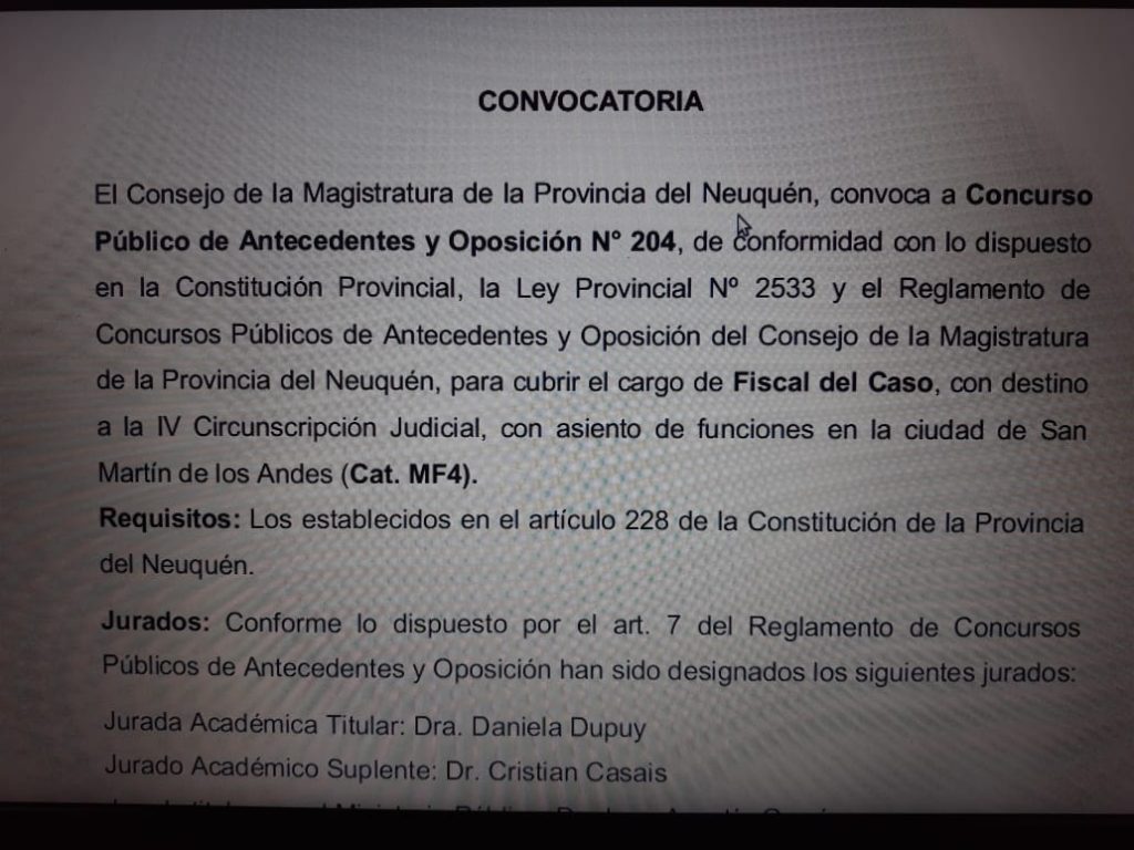 LLAMADO A CONCURSO PÚBLICO N° 204, DESTINADO A CUBRIR UN CARGO DE FISCAL DEL CASO, CON ASIENTO DE FUNCIONES EN LA CIUDAD DE SAN MARTÍN DE LOS ANDES.