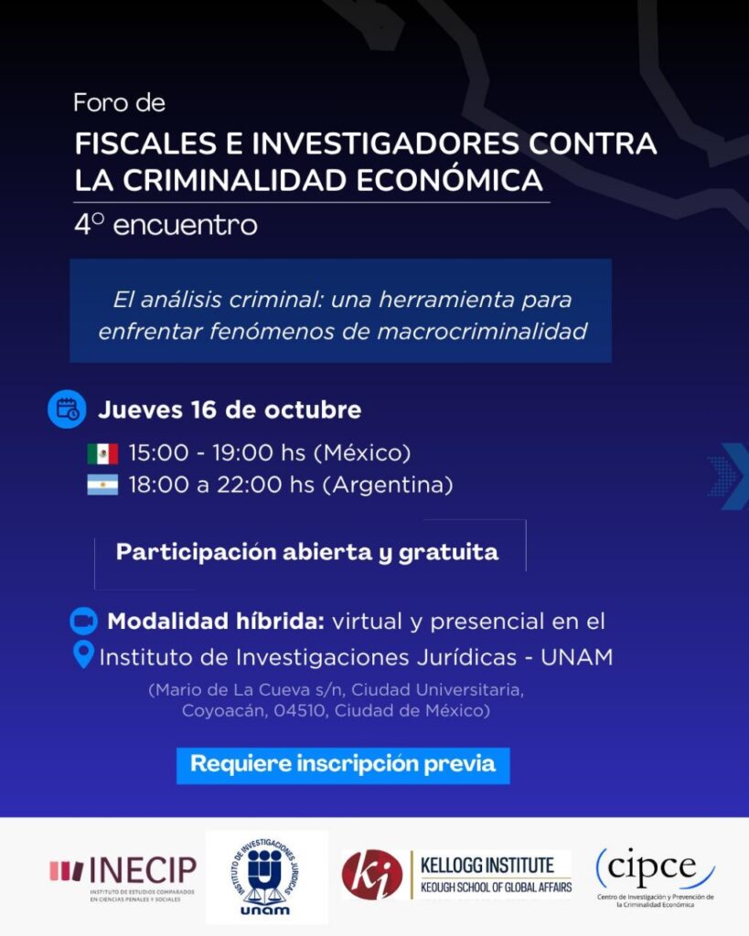 El Instituto de Estudios Comparados en Ciencias Penales y Sociales (INECIP) y su Centro de Investigación y Prevención de Criminalidad Económica (CIPCE) invitan a participar del 4.º Encuentro del Foro de Fiscales e Investigadores contra la Criminalidad Económica, un espacio creado para sistematizar experiencias, conocimientos y herramientas prácticas de quienes, por primera vez en la historia de América Latina, han logrado avanzar en la investigación y persecución de delitos económicos.
