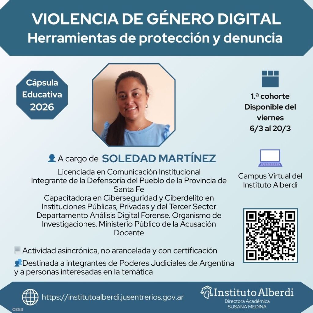 Para más información: https://institutoalberdi.jusentrerios.gov.ar/events/capsula-educativa-violencia-de-genero-digital-herramientas-de-proteccion-y-denuncia/
