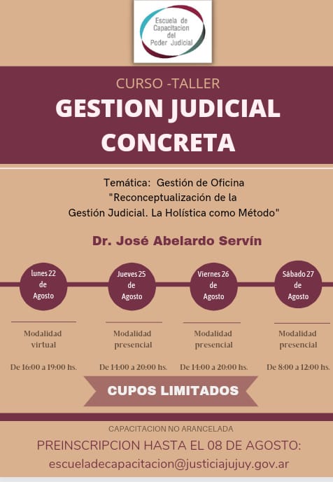 En el marco de las actividades continuas y sistemáticas propuestas por la Escuela de Capacitación del Poder Judicial, se dictará un curso- taller denominado “Gestión Judicial Concreta (GECON); Reconceptualización de la Gestión Judicial y La Holística como Método”, el cuál estará a cargo del Dr. José Abelardo Servín.