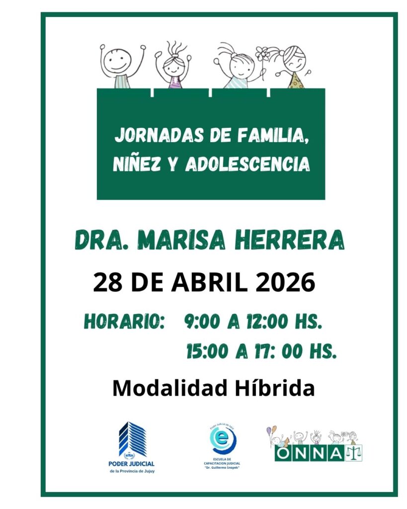 Las jornadas, se realizarán bajo modalidad híbrida el día 28 de abril del corriente año, de 9:00 a 12:00 y de 15:00 a 17:00 hs.; y estarán destinadas de manera obligatoria a Funcionarios de: Cámara de Apelaciones de Familia, Juzgados de Familia – S. Salvador de Jujuy, Juzgados de Violencia de Género Nº 1 y 2, Equipos Interdisciplinarios, Registro Único de Adopción, Oficina de Gestión Civil, ONNA, Funcionarios de la Suprema Corte de Justicia – Sala I, Juzgados de Familia – San Pedro, Juzgados de Violencia de Género Nº 3, 4, 5 y 6, Juzgados de Primera Instancia de Familia – Perico y LGSM.