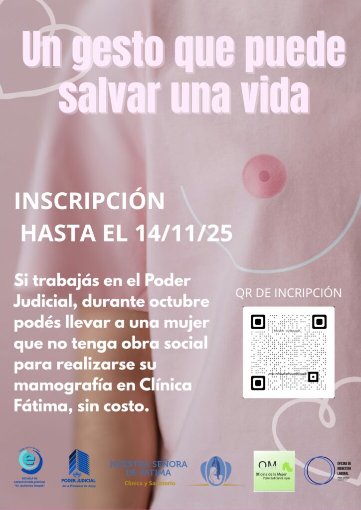 A partir de este convenio, durante todo el mes de octubre, las personas que se desempeñan en el Poder Judicial de Jujuy podrán llevar a una mujer que NO CUENTE con obra social para que se realice una mamografía sin costo en dicha institución médica.