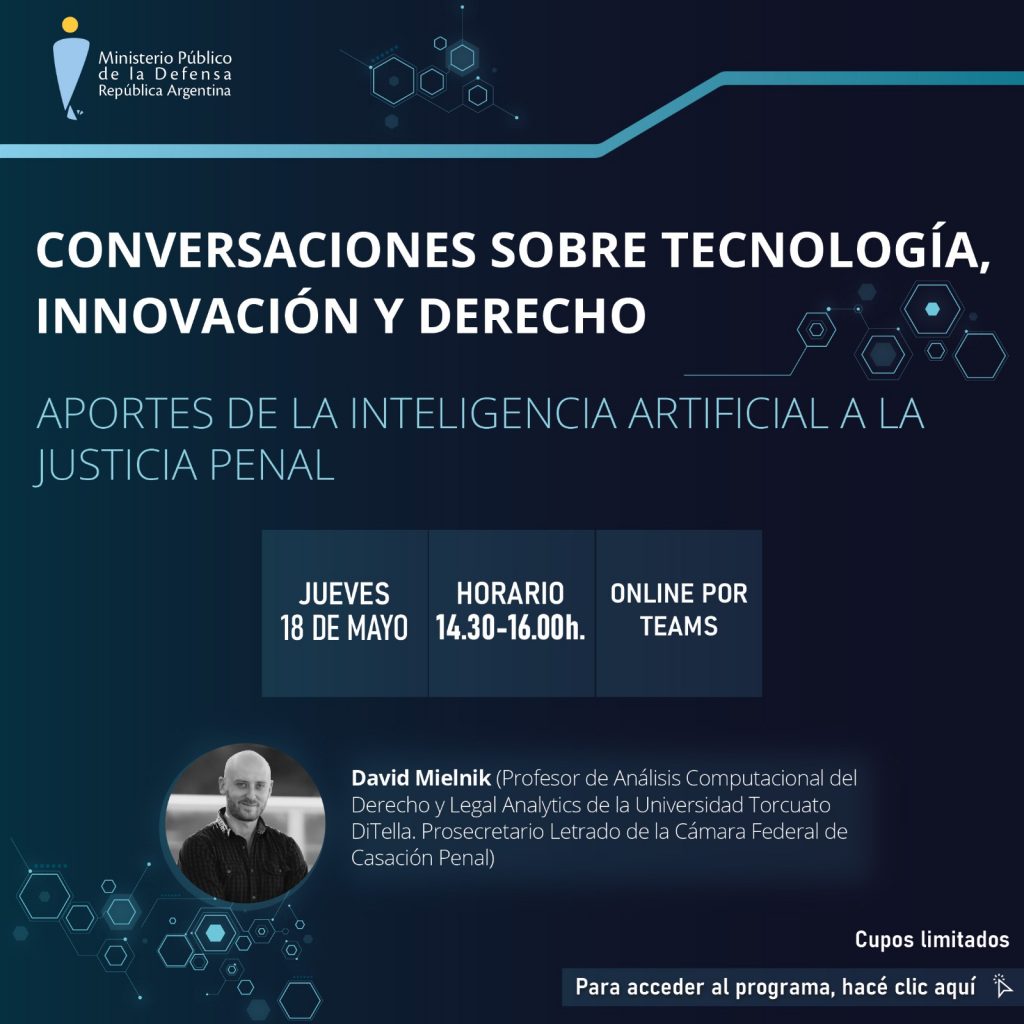 Organiza: Secretaría General de Capacitación y Jurisprudencia del Ministerio Público de la Defensa de la República Argentina. Tema: Aportes de la Inteligencia Artificial a la Justicia Penal Fecha y horario: jueves 18 de mayo, de 14:30 a 16:00 horas. Modalidad: Online. Disertante: Prof. David Mielnik. Link de Inscripcion Escuela de Capacitación Judicial de Jujuy “Dr. […]