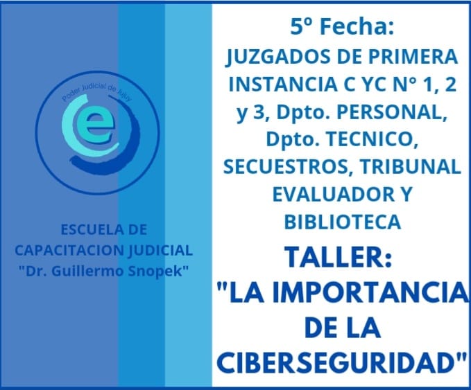 Organizado por la Escuela de Capacitación Judicial “Dr. Guillermo Snopek”, continúa el día lunes 03 de abril, el ciclo de talleres sobre “La importancia de la Ciberseguridad: nociones básicas y buenas prácticas”. La jornada de capacitación será de 15 a 16 horas, en el salón Vélez Sarsfield del edificio central del Poder Judicial, ubicado en […]