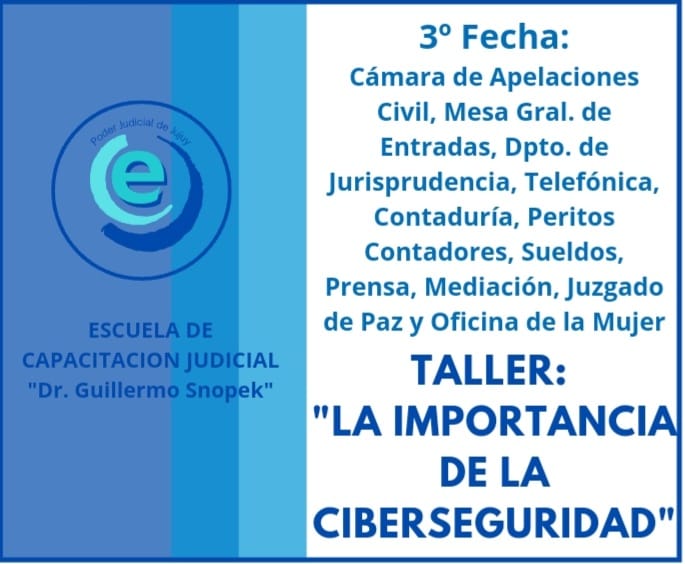 Organizado por la Escuela de Capacitación Judicial “Dr. Guillermo Snopek”, continúa el día lunes 20 de marzo, el ciclo de talleres sobre “La importancia de la Ciberseguridad: nociones básicas y buenas prácticas”. La jornada de capacitación será de 15 a 16 horas, en el salón Vélez Sarsfield del edificio central del Poder Judicial, ubicado en […]