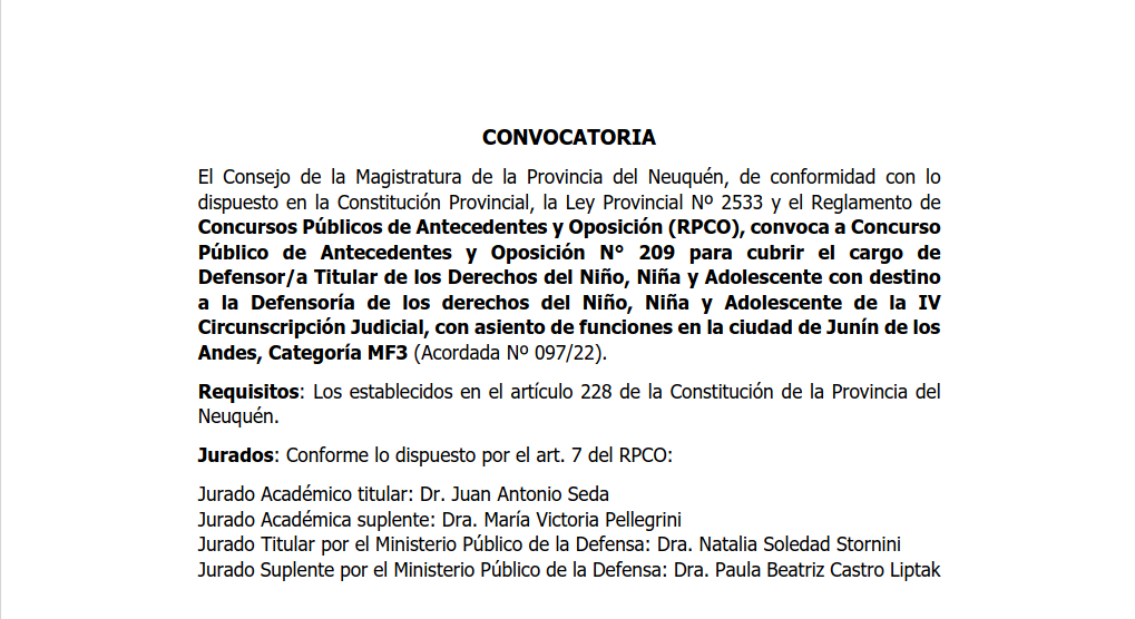 CONVOCATORIA PARA CUBRIR EL CARGO DE DEFENSOR/A TITULAR DE LOS DERECHOS DEL NIÑO, NIÑA Y ADOLESCENTE CON DESTINO A LA DEFENSORÍA DE LOS DERECHOS DEL NIÑO, NIÑA Y ADOLESCENTE DE LA IV CIRCUNSCRIPCIÓN JUDICIAL, CON ASIENTO DE FUNCIONES EN LA CIUDAD DE JUNÍN DE LOS ANDES.