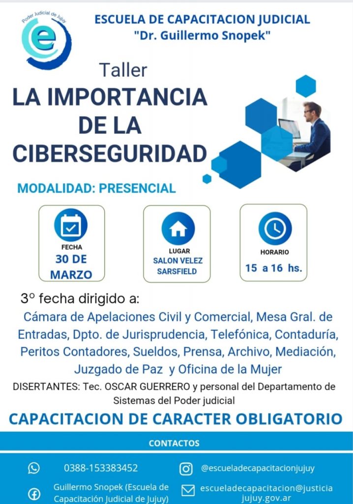Organizado por la Escuela de Capacitación Judicial “Dr. Guillermo Snopek”, continúa el día jueves 30 de marzo, el ciclo de talleres sobre “La importancia de la Ciberseguridad: nociones básicas y buenas prácticas”.