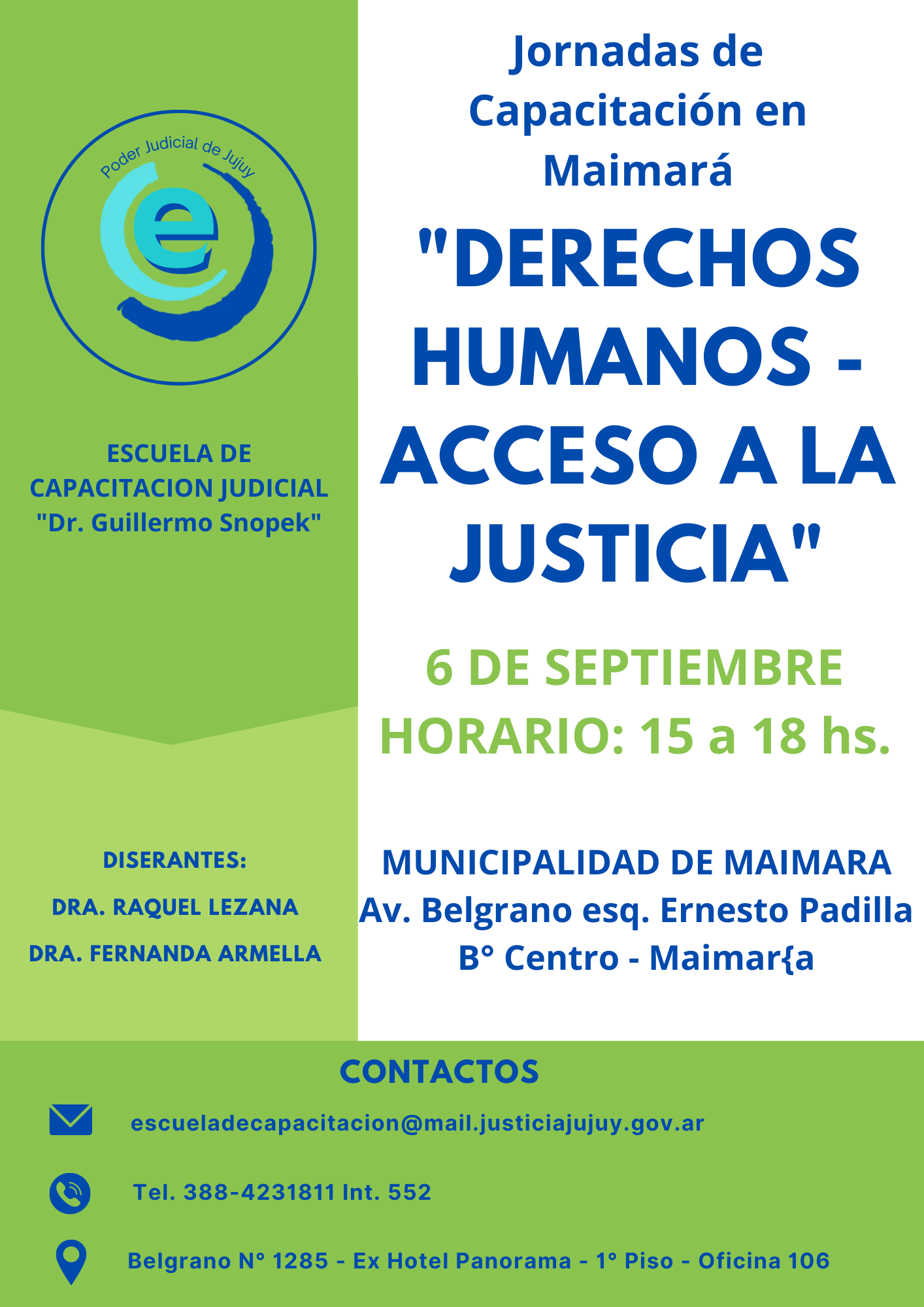 Organizado por la Escuela de Capacitación Judicial “Dr. Guillermo Snopek”, se llevará a cabo el día 6 de septiembre del año en curso, la capacitación sobre “Derechos Humanos-Acceso a la Justicia”, en el municipio de Maimara.