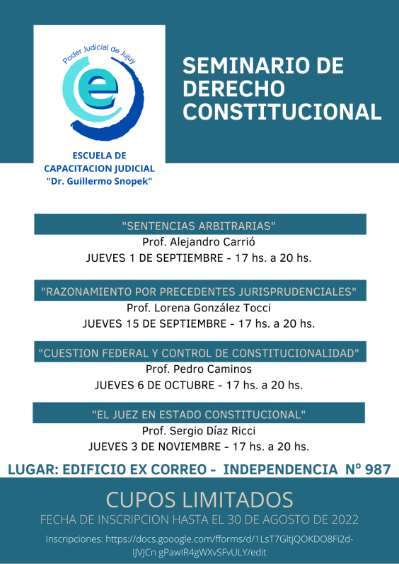 La Escuela de Capacitación Judicial “Dr. Guillermo Snopek”, organiza un “Seminario de Derecho Constitucional”, el cuál tiene como fin abordar problemas prácticos de las decisiones judiciales, con una perspectiva actual del Derecho Constitucional.