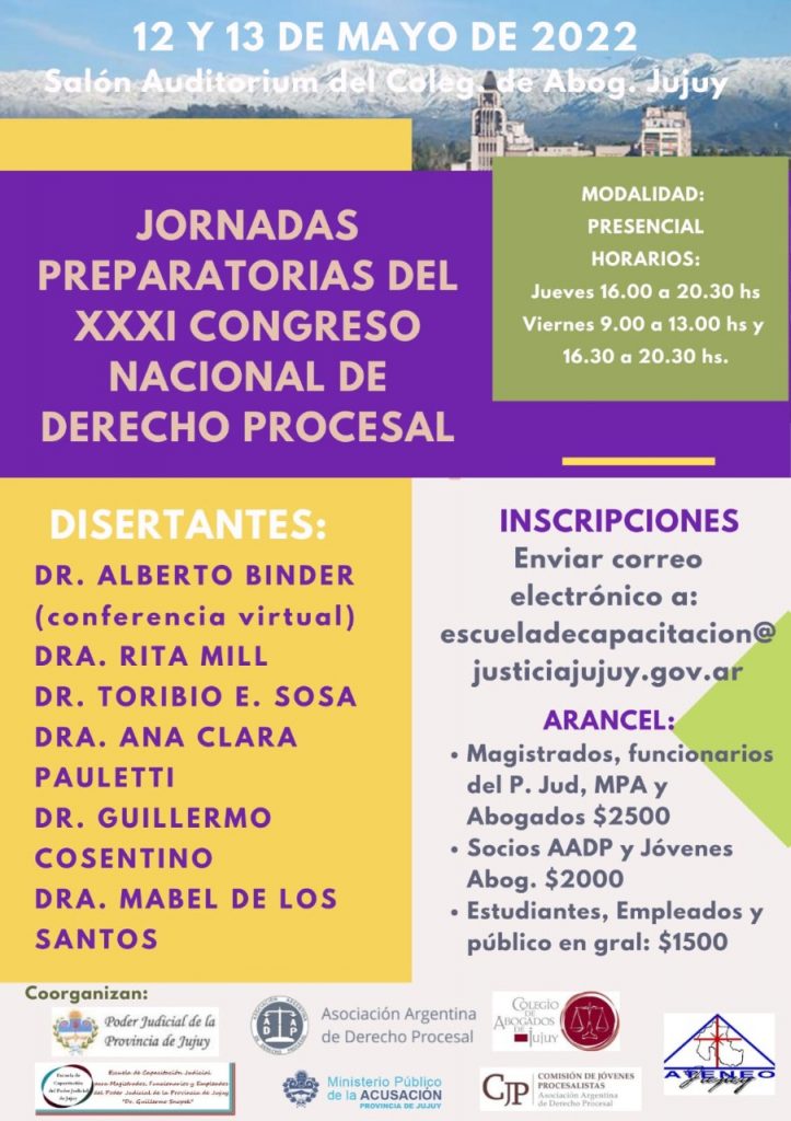 Las Jornadas son organizadas por el Poder Judicial de Jujuy a través de la Escuela de Capacitación, el Ministerio Público de la Acusación, la Asociación Argentina de Derecho Procesal, el Colegio de Abogados y Procuradores de Jujuy, la filial Jujuy del Ateneo de Estudios del Proceso Civil de Rosario y la Comisión de Jóvenes Procesalistas de la Asociación Argentina de Derecho Procesal. .