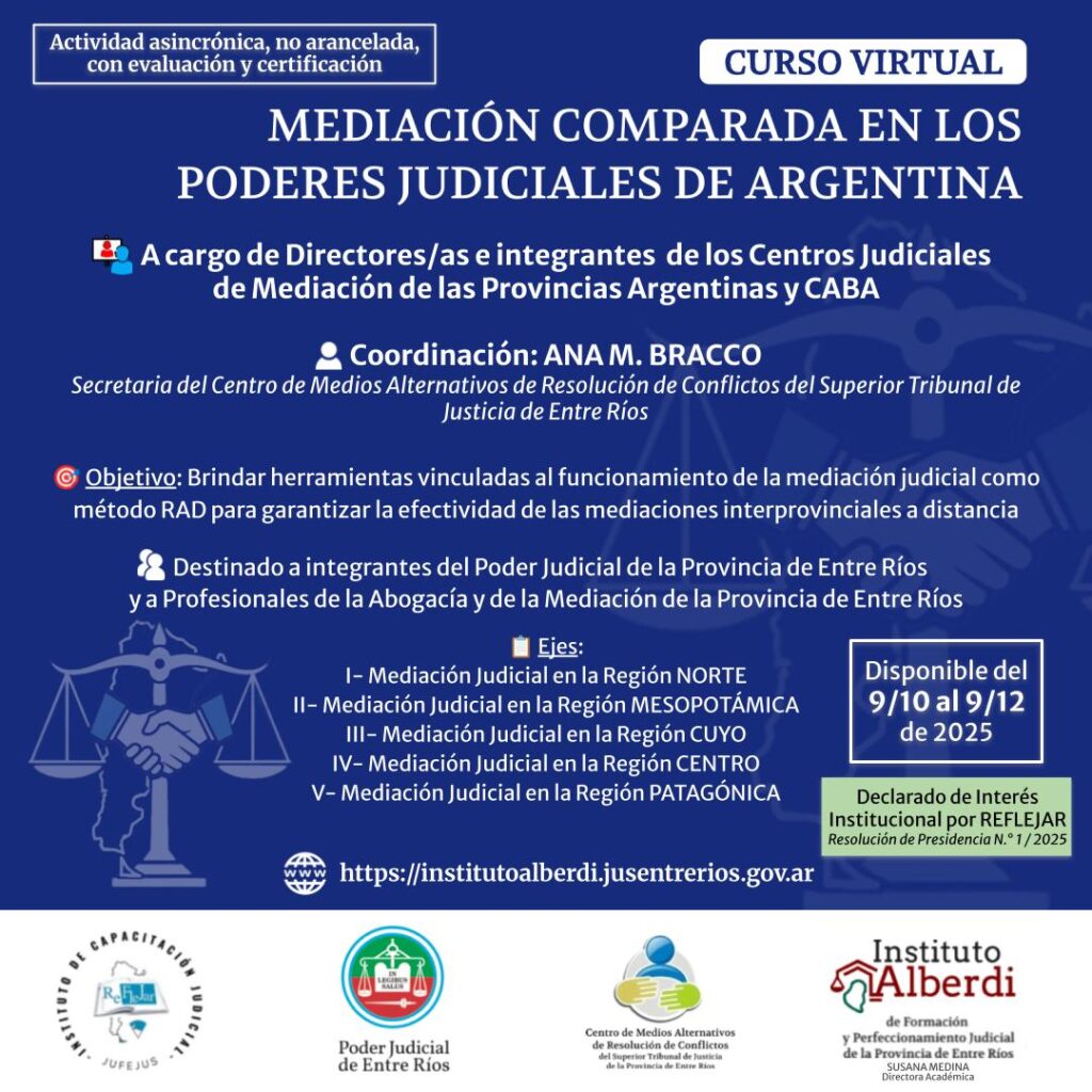 🌐 Más información: https://institutoalberdi.jusentrerios.gov.ar/events/curso-virtual-mediacion-comparada-en-los-poderes-judiciales-de-argentina/